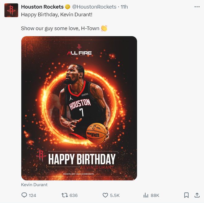 美国时间的9月29日恰巧是火箭新援凯文-杜兰特37岁的生日,火箭队官方也祝贺KD生日快乐,而且这一天也是休斯顿火箭队的媒体日,这对于杜兰特来说算是双喜临门,因为这支球队对他的爱很热烈。
