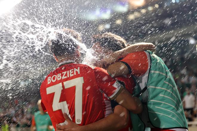 比赛第75分钟,阿米里点射命中,美因茨1-0领先。然而美因茨队员们并未高兴太久,因为他们在庆祝时遭到对方球迷的“狂轰滥炸”,博济恩被其中一个水瓶砸中倒地不起。裁判中断比赛,双方球员不得不回到更衣室。
