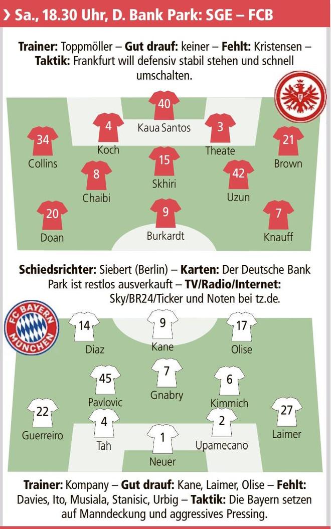 10月4日讯 北京时间10月5日00:30,德甲第6轮,法兰克福坐镇主场迎战德甲领头羊拜仁慕尼黑,本场比赛开始之前,德国媒体《慕尼黑日报》预测了双方的首发阵容,拜仁慕尼黑由目前脚感火热的凯恩领衔,法兰克福方面会继续首发连场进球的土耳其小将詹·乌尊。