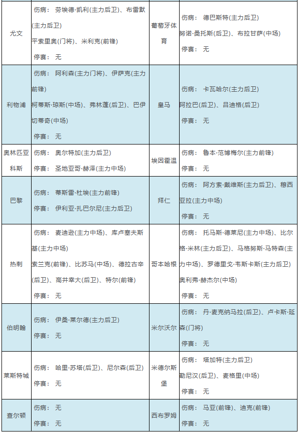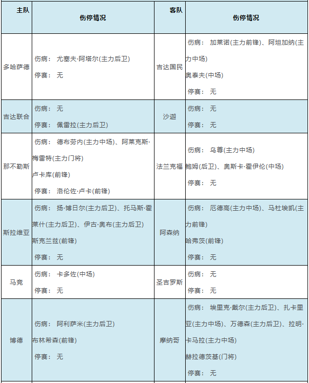 伤停点评:胜负彩第25160期由亚冠精英、欧冠和英冠赛事组成。亚冠精英赛场,吉达联合主力后卫佩雷拉停赛;欧冠赛场,那不勒斯两名主力伤缺,摩纳哥中后场4大主力受伤无法出场,利物浦主力前锋伊萨克因伤缺阵,热刺伤兵满营失去7人。
