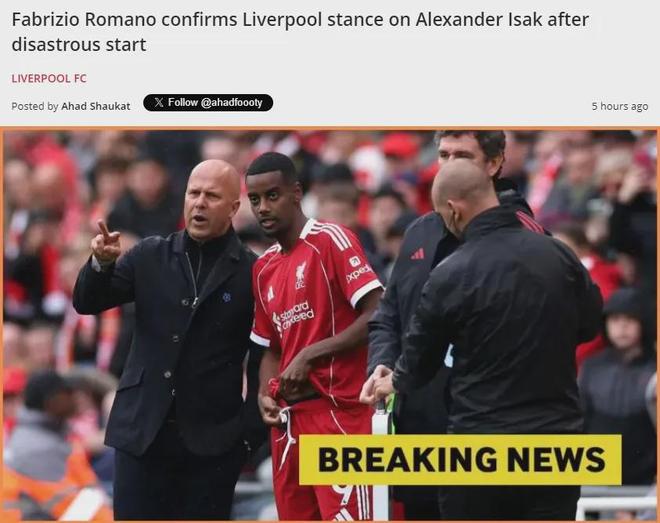 罗马诺在Here We Go podcast上谈到了伊萨克目前在利物浦的情况,他表示红军对这名前锋依然很有信心。