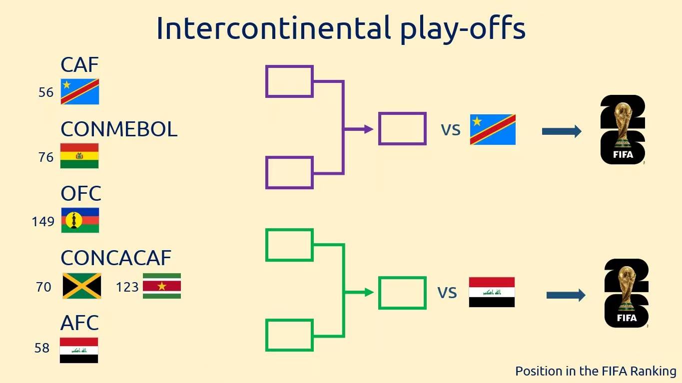 根据规则,来自五大洲的6队将参加洲际附加赛争夺2个世界杯正赛名额,比赛为单场淘汰制。其中,FIFA排名靠前的2队为种子队,直接进入决赛,剩余4队两两PK进行一场半决赛。最终,在决赛胜出的队伍将参加世界杯。据悉,洲际附加赛将于明年3月份在2026世界杯东道主之一的墨西哥进行。