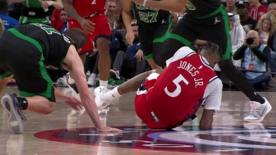 在经过队医的简单检查之后,小琼斯被工作人员架着返回更衣室。值得一提的是,这已经是小琼斯本赛季对阵凯尔特人时第二次受伤了,上次双方交手,他曾遭遇膝盖内侧副韧带扭伤。