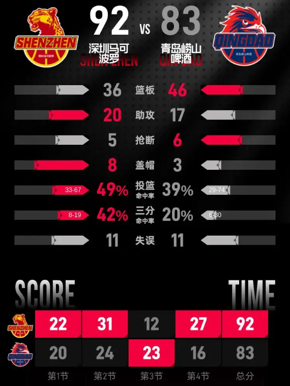 最后一节,青岛崂山啤酒的开局状态不佳,深圳马可波罗则手感火热,迅速抹平比分并建立起9分的领先优势。尽管青岛在小节后段逐渐缩小分差,但终究无法逆转局势。深圳马可波罗的特奎维恩·史密斯在本节比赛中斩获14分,帮助球队以92-83赢下比赛。