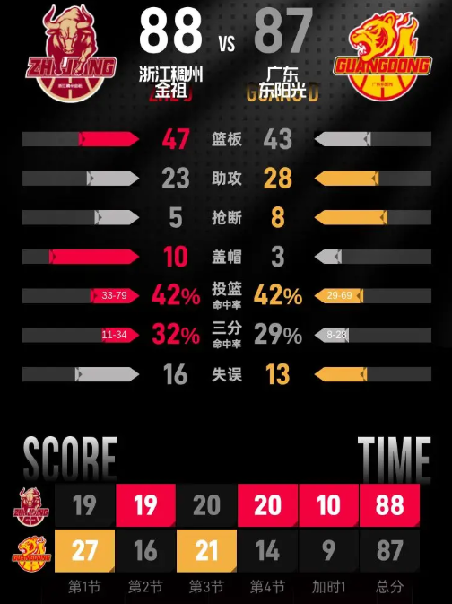 进入第一个加时赛,广东东阳光与浙江稠州金租的较量愈发接近,双方势均力敌,场上比分交替上升,竞争异常激烈。最终,约克上演三分绝杀,浙江稠州金租以88-87小胜,赢得了比赛的胜利。