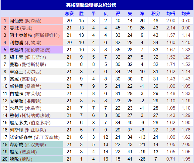 英超第21轮结束了9场比赛,最新积分榜如下!