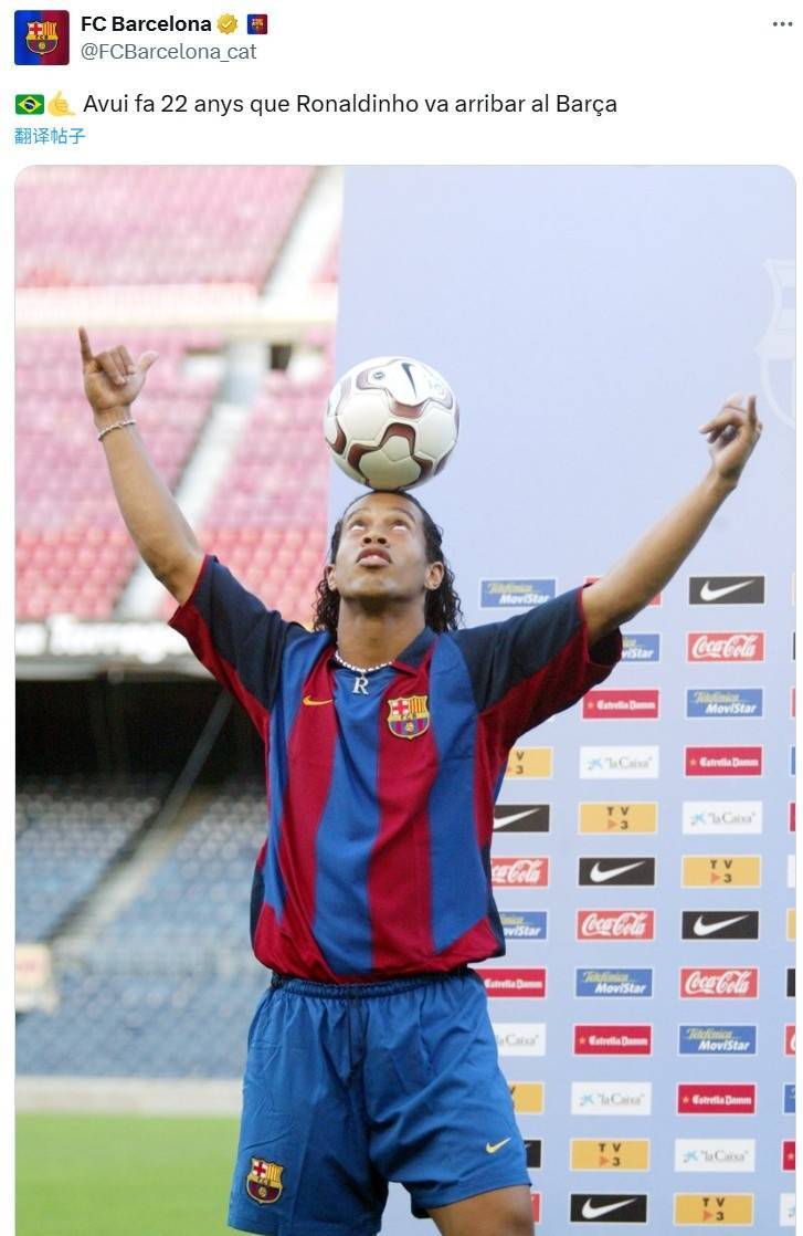 7月21日讯 今天是小罗转会巴萨的第22周年纪念日,巴萨官方社交媒体发布小罗加盟时照片,向这位传奇球星致以敬意。