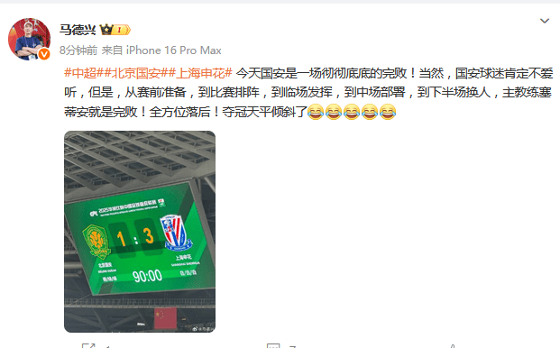 体坛周报马德兴:今天国安是一场彻彻底底的完败!当然,国安球迷肯定不爱听,但是,从赛前准备,到比赛排阵,到临场发挥,到中场部署,到下半场换人,主教练塞蒂安就是完败!全方位落后!夺冠天平倾斜了