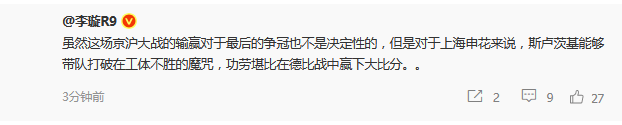 足球报李璇:虽然这场京沪大战的输赢对于最后的争冠也不是决定性的,但是对于上海申花来说,斯卢茨基能够带队打破在工体不胜的魔咒,功劳堪比在德比战中赢下大比分。