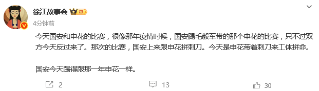 今天国安和申花的比赛,很像那年疫情时候,国安踢毛毅军带的那个申花的比赛,只不过双方今天反过来了。那次的比赛,国安上来跟申花拼刺刀。今天是申花带着刺刀来工体拼命。国安今天踢得跟那一年申花一样。