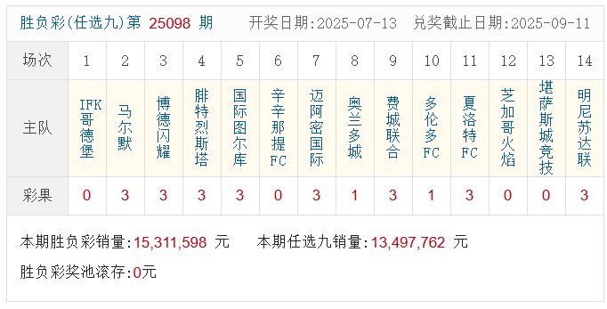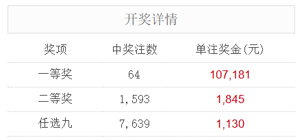 北京时间7月13日,足彩25098期开奖。本期全国中出一等奖64注,每注奖金107,181元,二等奖中出1,593注,每注奖金1,845元。另外,任选9场中出7,639注,每注奖金1,130元。