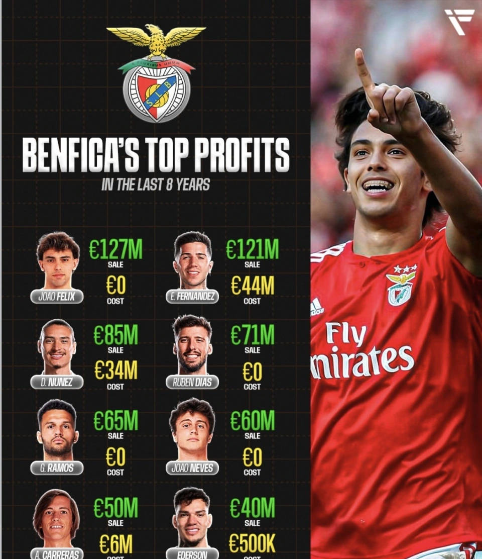 数据显示,本菲卡成功进行了多笔高价球员转会: