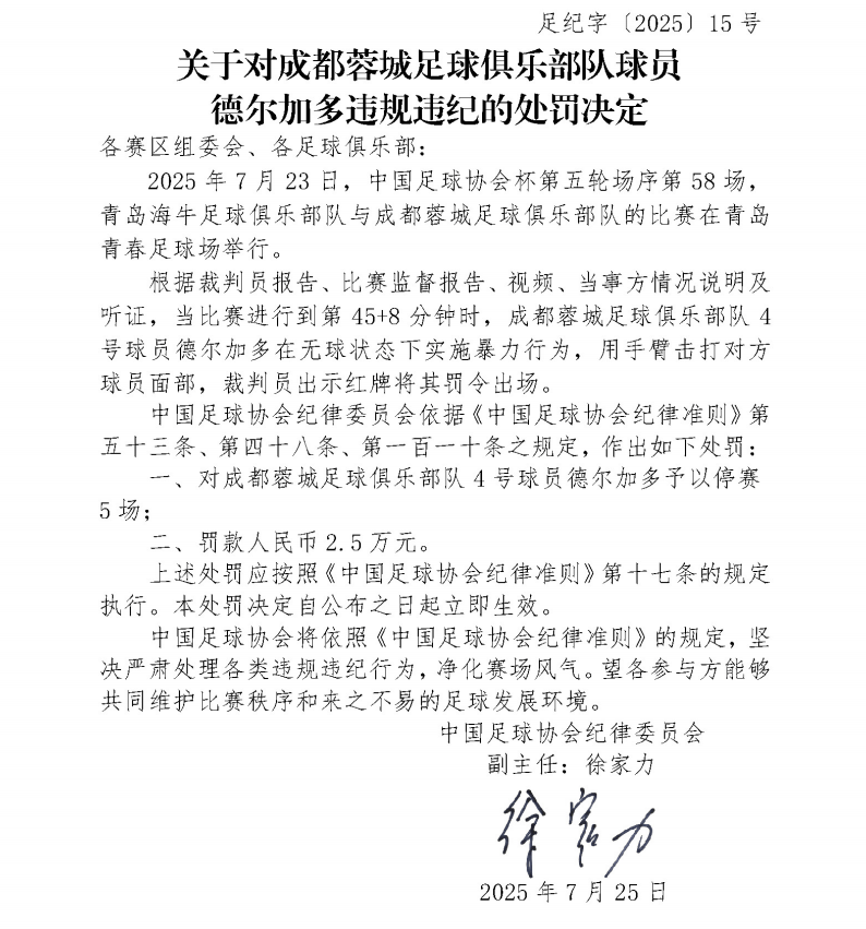 北京时间7月25日消息,中国足协官方今日发布公告,成都蓉城球员德尔加多此前在足协杯对阵青岛海牛的比赛中用手臂击打对方球员面部,予以停赛5场,罚款2.5万元的处罚。