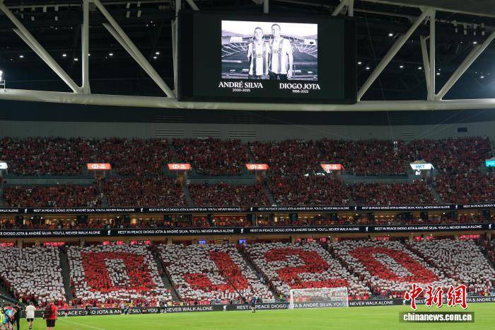 7月26日晚,“香港足球盛会2025”首场表演赛在香港启德体育园主场馆举行,意甲球队AC米兰4:2战胜英超球队利物浦。图为现场球迷悼念7月3日因车祸离世的利物浦前锋、葡萄牙球员迪奥戈·若塔(Diogo Jota)和他的兄弟、同为职业球员的安德烈。 中新社记者 陈永诺 摄
