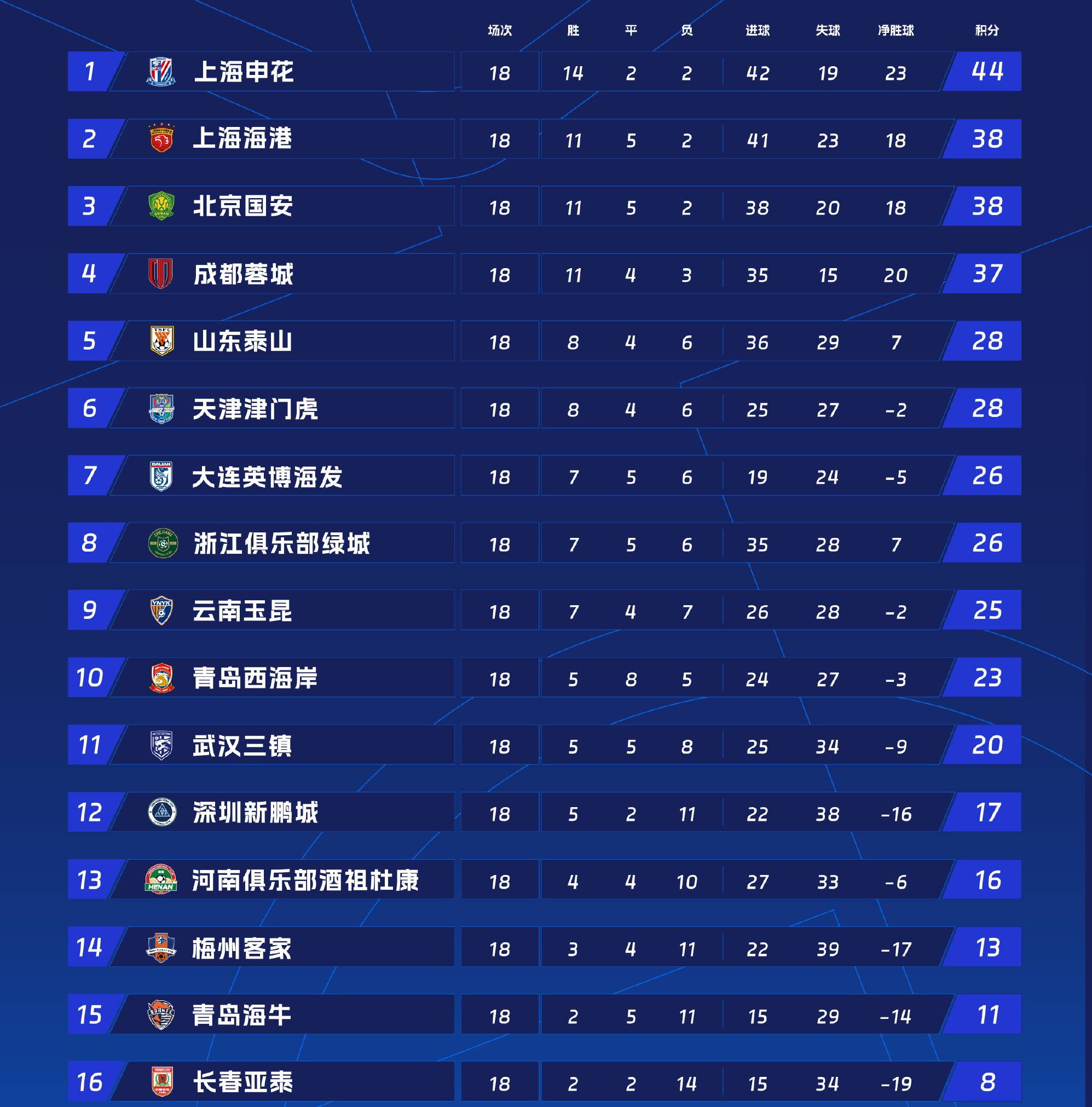 中超最新积分榜:申花甩开上海海港+国安+成都蓉城