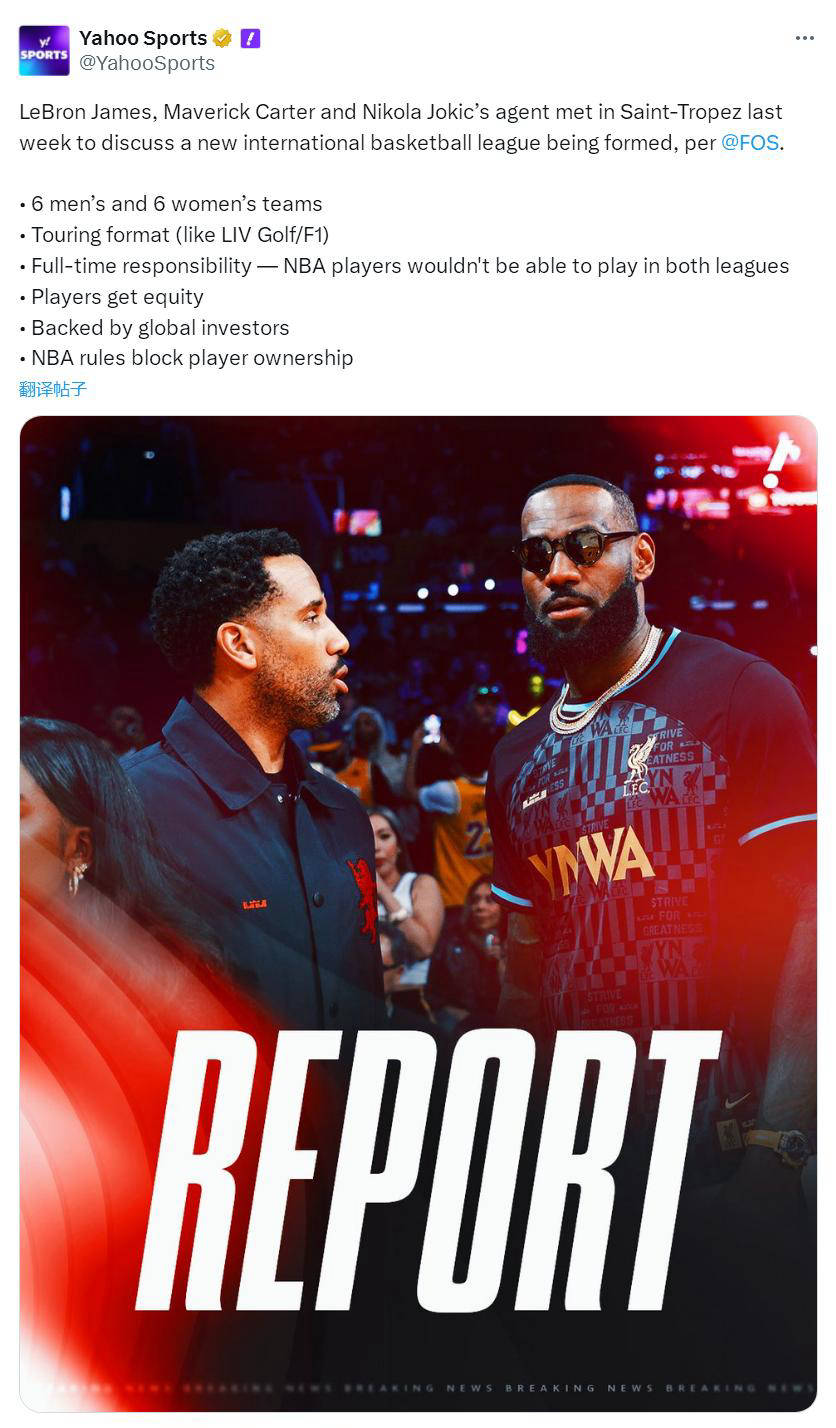 时间:2025-08-01 08:35:33北京时间7月31日,据雅虎体育等媒体报道,詹姆斯和约基奇的经纪人拉兹纳托维奇在法国游艇上会面,共同商讨组建一个全新的国际篮球联赛,以对抗NBA的霸主地位。与其联手合作,他们计划推出一项全新的篮球巡回赛,将在全世界8个不同城市展开比赛,类似于F1方程式赛车的形式。该联赛初期规模不会太大,包括6支男子球队和6支女子球队,旨在成为一场全职比赛,并且明确规定不允许NBA和WNBA现役球员兼职参加,但允许球员持股参与其中。