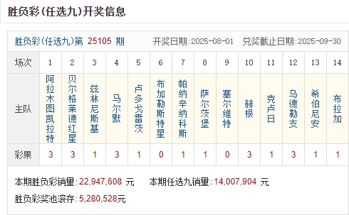 足彩25105期开奖结果:一等奖1注 单注奖金500万元