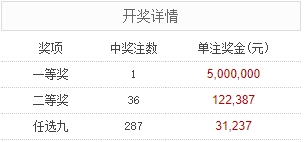 北京时间8月1日,足彩25105期开奖。本期全国中出一等奖1注,每注奖金5,000,000元,二等奖中出36注,每注奖金122,387元。另外,任选9场中出287注,每注奖金31,237元。