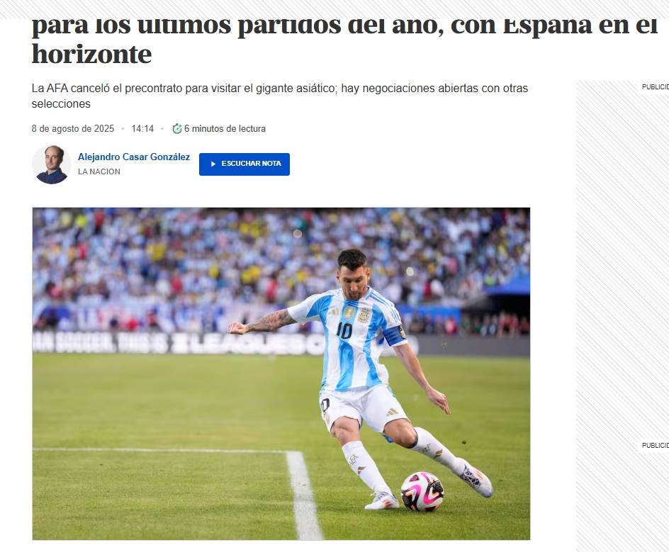 《民族报》报道称,本周四,阿根廷足协解除了一项预约签订的合同,该合同涉及10月份在中国的热身赛。据阿根廷足协透露,此前他们与来自中国的主办方签订了10月6日-14日前往中国参加两场友谊赛的合同,但负责此次赛事的公司从未履行合同中规定的条款。因此,在距离10月的国家比赛日还有两个月的时间时,阿根廷足协不得不为国家队寻找其他比赛对手。