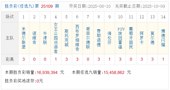 足彩25109期开奖结果:一等奖11注 单注奖金68.9万