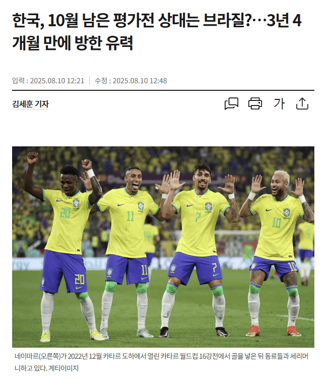 北京时间8月10日消息,据韩国媒体“sportskhan”报道称,在锁定2026世界杯决赛圈名额后,韩国男足正计划与世界强队踢友谊赛,预计在10月份邀请巴西队进行对决。如果巴西队再次访韩,将是自2022年6月以来,时隔3年4个月后再次来访。另外,日本媒体爆料称,已经拿到世界杯正赛名额的日本男足计划在11月与阿根廷男足进行热身赛。