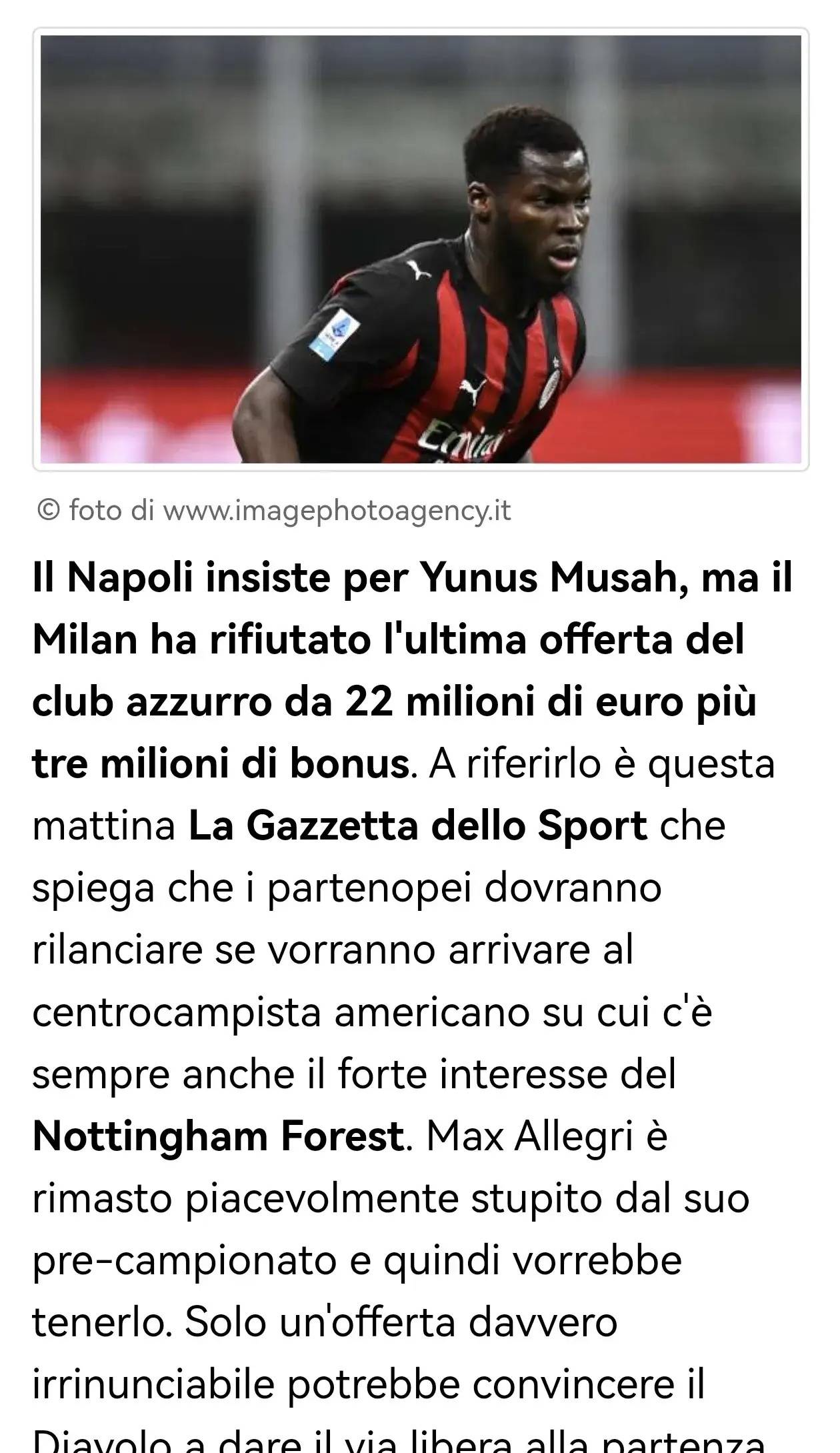 《米兰体育报》今日报道了这一消息,并表示,若想签下这位美国中场——诺丁汉森林也对其保持浓厚兴趣——那不勒斯必须提高报价。马西米利亚诺·阿莱格里对穆萨在季前赛中的表现颇为惊喜,因此希望留住他。只有一份极具诱惑力的报价才可能让红黑军团同意这位前瓦伦西亚球员离队。
