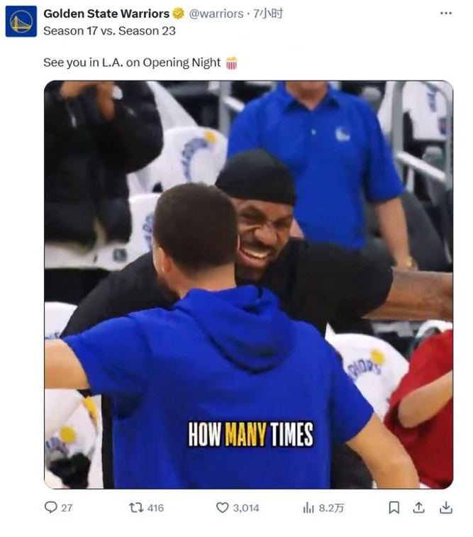 勇士官推预热库里VS詹姆斯:揭幕战见 时间:2025-08-13 09:35:52 勇士官推:第17个赛季VS第23个赛季,LA的揭幕战见 揭幕战北京时间10月22日上午10:00,勇士客场挑战湖人 相关消息 ·佩德里:巴萨中场不可替代的指挥官 ·官方:莫拉塔租借加盟科莫 ·西甲引援王诞生!马德里竞技补强力量超越皇马 ·新赛季西甲将至!皇马巴萨迎“10号”新时代