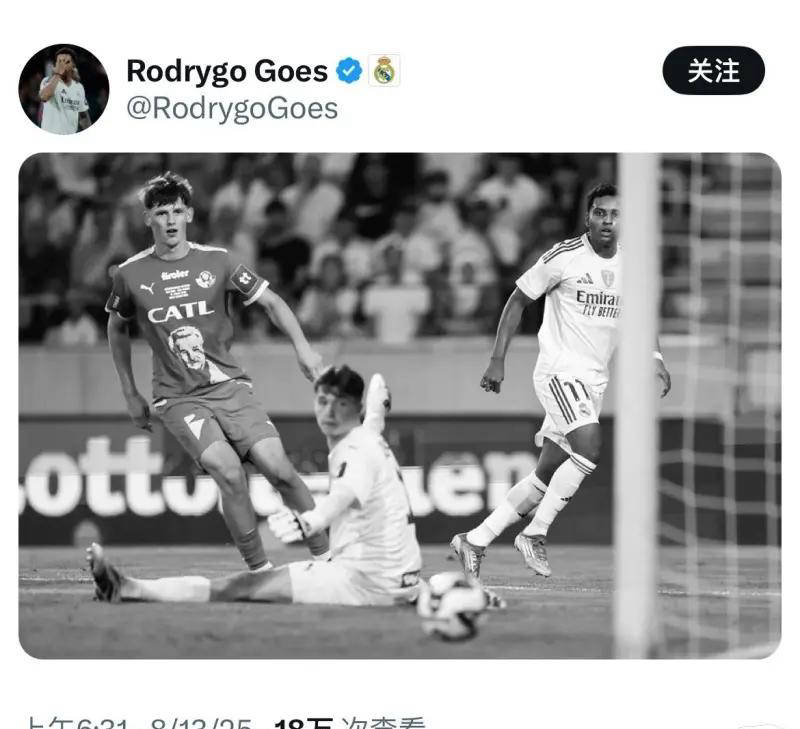 在周三与瓦滕斯进行的热身赛中,罗德里戈在下半场第62分钟替补出场,第81分钟接到维尼修斯的传球后射门得分。但罗德里戈并没有像往常一样庆祝,赛后默默离场。值得一提的是,他在社交媒体上发布的黑白照正是这次进球的瞬间。这场比赛可能成为巴西边锋在皇马的告别演出。