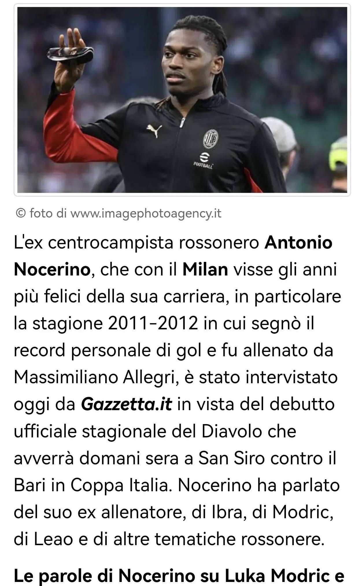在米兰即将于明晚在圣西罗对阵巴里的意大利杯赛事中开启本赛季正式比赛之际,诺切里诺接受了《米兰体育报》的采访,谈及了他的前主帅、伊布、莫德里奇、莱奥等米兰相关话题。