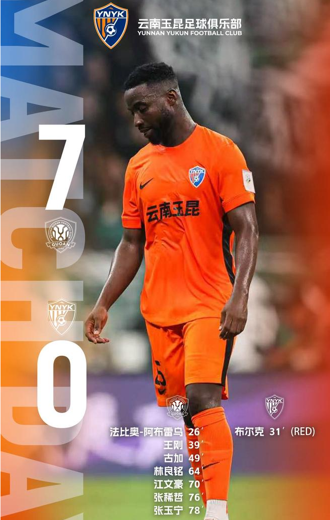 云南玉昆官方写道:“2025中国足协杯半决赛,客场作战的云南玉昆最终以0比7不敌对手。上半场第31分钟,布尔克被红牌罚下彻底改变了比赛的走势。很遗憾,我们没能在今天继续改写云南足球的历史,止步足协杯决赛门外,向所有支持云南玉昆的球迷朋友们说一声抱歉。”