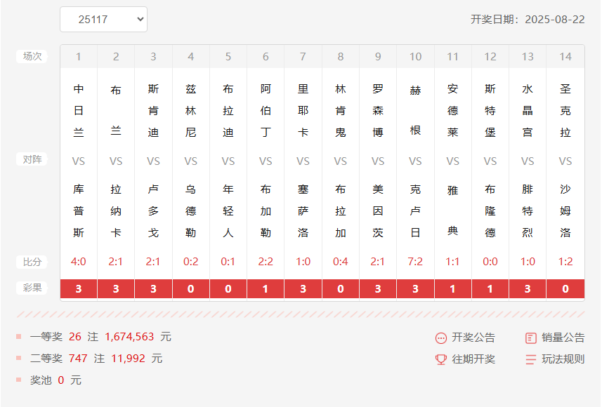 足彩25117期开奖结果:一等奖26注,单注奖金167.4万元