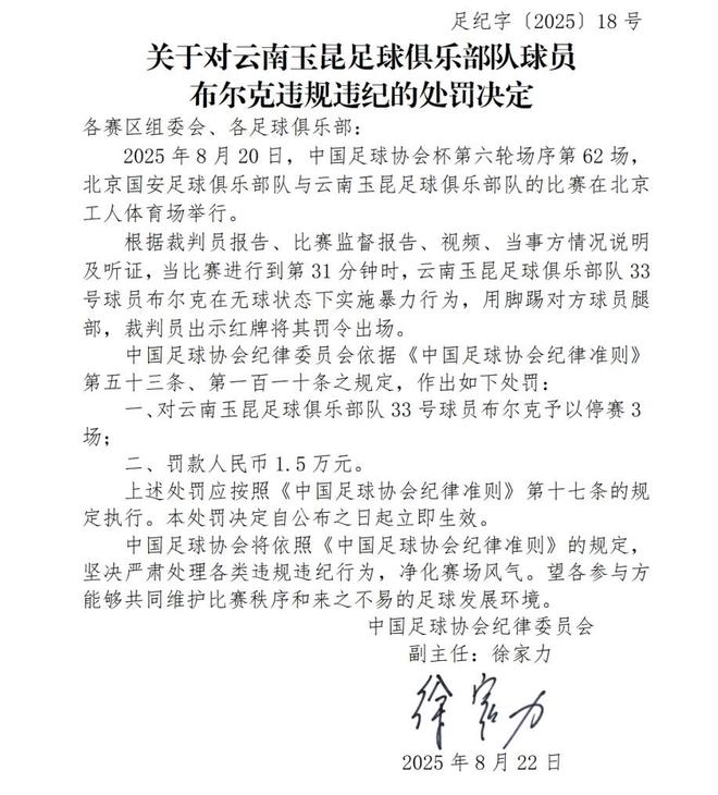 时间:2025-08-23 10:39:44北京时间8月22日晚,中国足协官方开出最新罚单,32岁的云南玉昆外援布尔克因为足协杯半决赛实施暴力行为,对其停赛3场,罚款1.5万元。