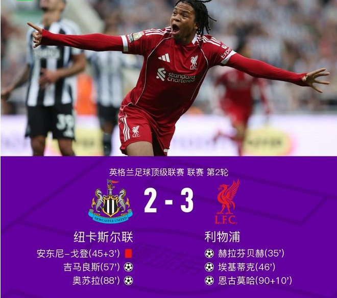 8月26日,英格兰足球顶级联赛第2轮,纽卡斯尔联坐镇主场迎战利物浦。 比赛第35分钟,加克波送出助攻,赫拉芬贝赫为利物浦首开纪录。上半场补时第3分钟,安东尼-戈登因犯规被红牌罚下,纽卡斯尔联在人数上陷入劣势。 易边再战,第46分钟,加克波再次送出助攻,埃基蒂克推射破门,利物浦扩大领先优势。第57分钟,利夫拉门托传中助攻吉马良斯头球破门,纽卡斯尔联扳回一城。第88分钟,奥苏拉禁区外远射得手,帮助纽卡斯尔联将比分追至2-3。 下半场补时第10分钟,萨拉赫助攻恩古莫哈破门,利物浦将比分最终锁定为3-2。 全场比赛结束,利物浦客场3-2战胜纽卡斯尔联。