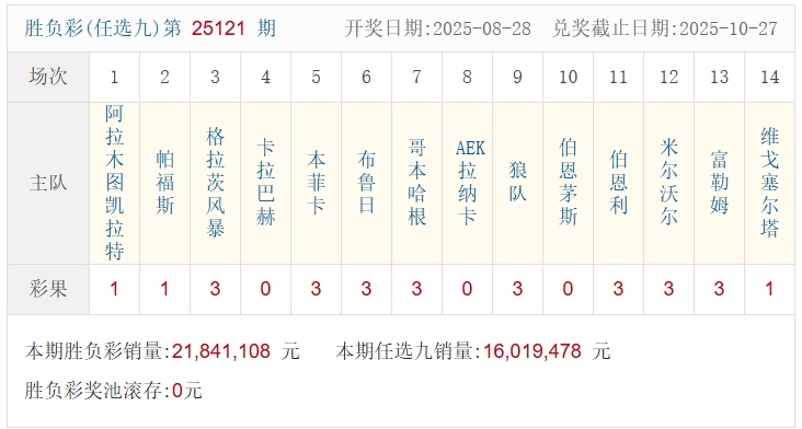 北京时间8月28日,足彩25121期开奖。本期全国中出一等奖18注,每注奖金846,069元,二等奖中出460注,每注奖金9,116元。另外,任选9场中出4,581注,每注奖金2,238元。