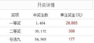 北京时间9月6日,足彩25126期开奖。本期一等奖中出1484注,每注奖金26,885元;二等奖中出38172注,每注奖金308元。另外,任选9场中出54969注,每注奖金177元。