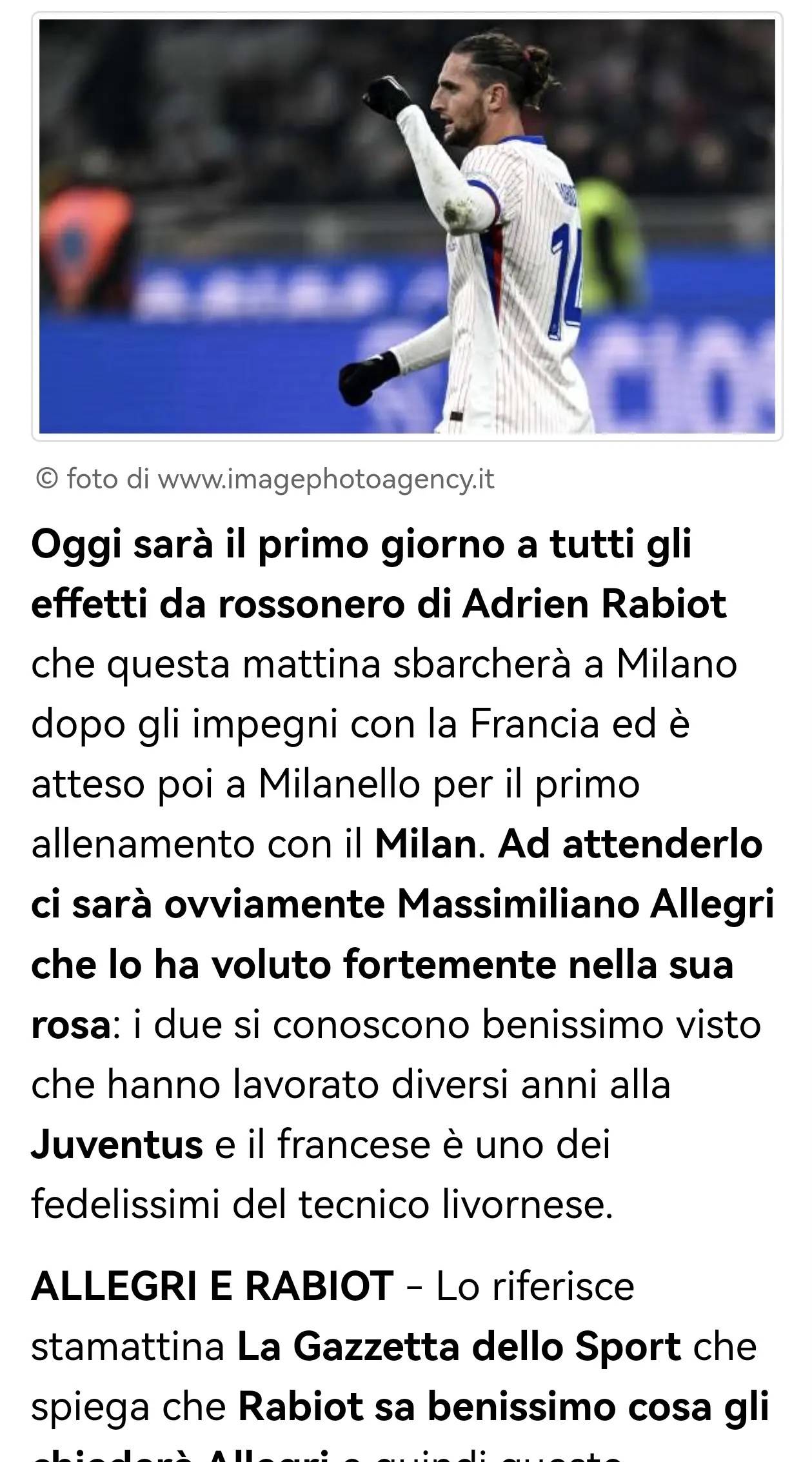 马西莫·阿莱格里将在训练基地等候他——阿莱格里一直强烈希望将拉比奥特纳入麾下。两人彼此十分熟悉,曾在尤文图斯共事多年,这位法国球员更是这位利沃诺籍教练最忠实的追随者之一。