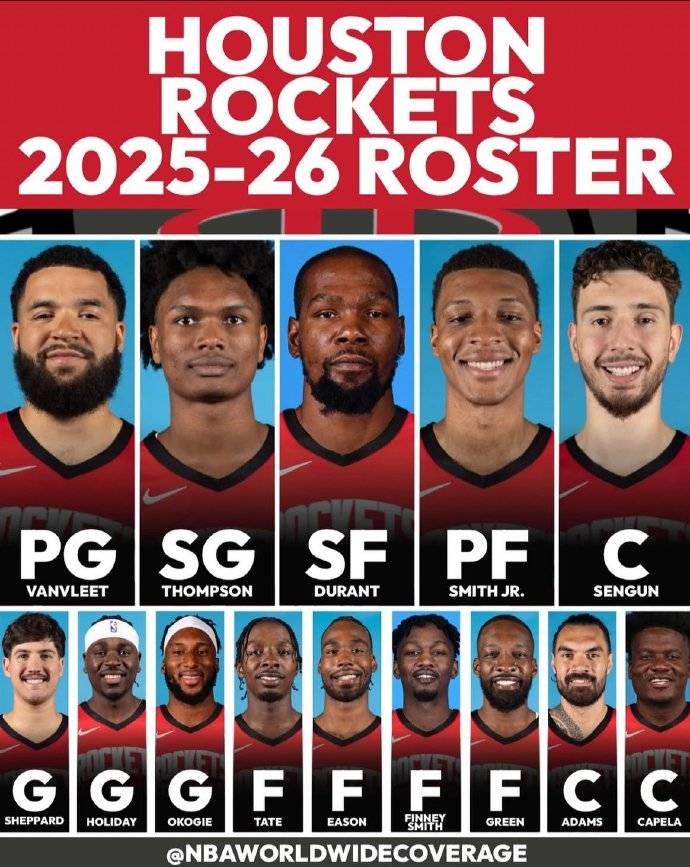 火箭目前阵容除上述五人外,还包括谢泼德、霍乐迪、奥科吉、泰特、伊森、芬尼-史密斯、杰夫-格林、亚当斯和卡佩拉。