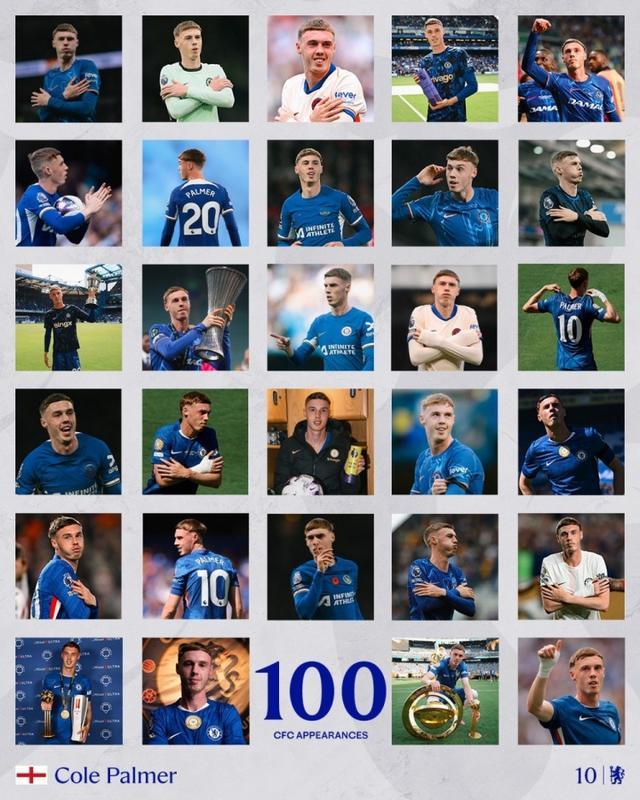 切尔西官方也晒出了海报为帕尔默作为纪念,并配文:“帕尔默在今晚完成了切尔西生涯第100场里程碑。”