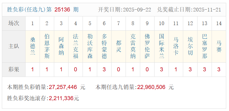 北京时间9月23日,足彩25136期开奖。本期全国中出一等奖2注,每注奖金5,000,000元,二等奖中出72注,每注奖金72,686元。另外,任选9场中出1,031注,每注奖金14,252元。