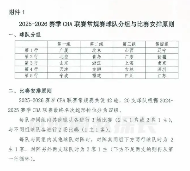 CBA新赛季常规赛42轮分4个小组 广东上海同组