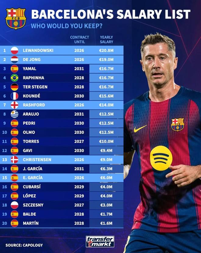 德转列巴萨队内年薪:莱万超2000万欧第1,亚马尔第3