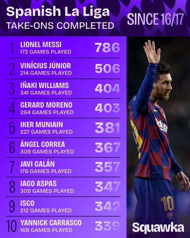 10月12日。有权威机构Squawka统计并公布了从2017赛季至今所有球员在西甲的成功过人次数排行榜前十。其中已经离开西甲四年、相当于让了五个赛季的梅西,依旧排名独一档!