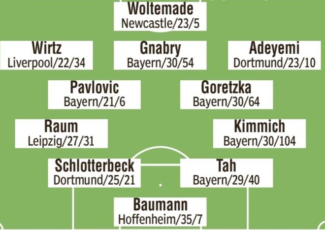 奥利弗-鲍曼;基米希、约纳坦-塔、施洛特贝克、劳姆;格雷茨卡、亚历山大-帕夫洛维奇;阿德耶米、格纳布里、维尔茨;沃尔特马德