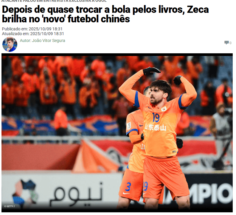 北京时间10月11日消息,巴西媒体《Ogol》日前对山东泰山外援泽卡进行了专访,在专访中泽卡谈到了目前在山东泰山的效力体验,并表示尽管如今中超联赛的投入已经比不上此前金元足球时期,但在经济层面上还是十分有吸引力。