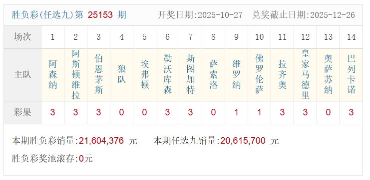 足彩25153期开奖结果:一等奖16注 单注奖金60万元
