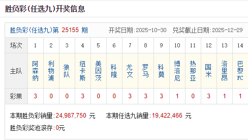 北京时间10月30日,足彩25155期开奖。本期全国中出一等奖39注,每注奖金287,038元,二等奖中出1967注,每注奖金2,439元。另外,任选9场中出7273注,每注奖金1,709元。