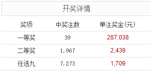 足彩25155期开奖结果:一等奖39注 单注奖金28.7万元