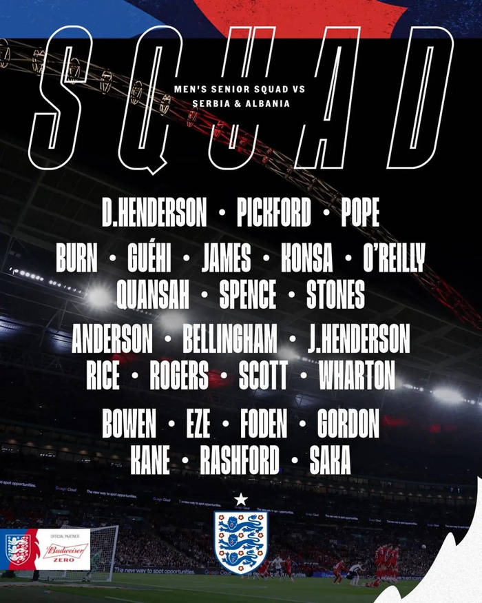 11月份,英格兰将在世预赛迎战塞尔维亚,客场对阵阿尔巴尼亚。
