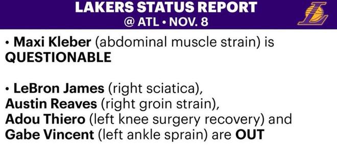 时间:2025-11-08 17:56:55北京时间今日,洛杉矶湖人队更新了伤病名单,球队主力后卫奥斯汀-里夫斯的伤情由此前右腹股沟酸痛变为右腹股沟拉伤,他将会缺席明日湖人客战老鹰的比赛。此外,加盟湖人后尚未上演首秀的克勒贝尔出战成疑。