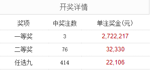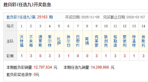 足彩25163期开奖结果:一等奖3注 单注奖金272万元